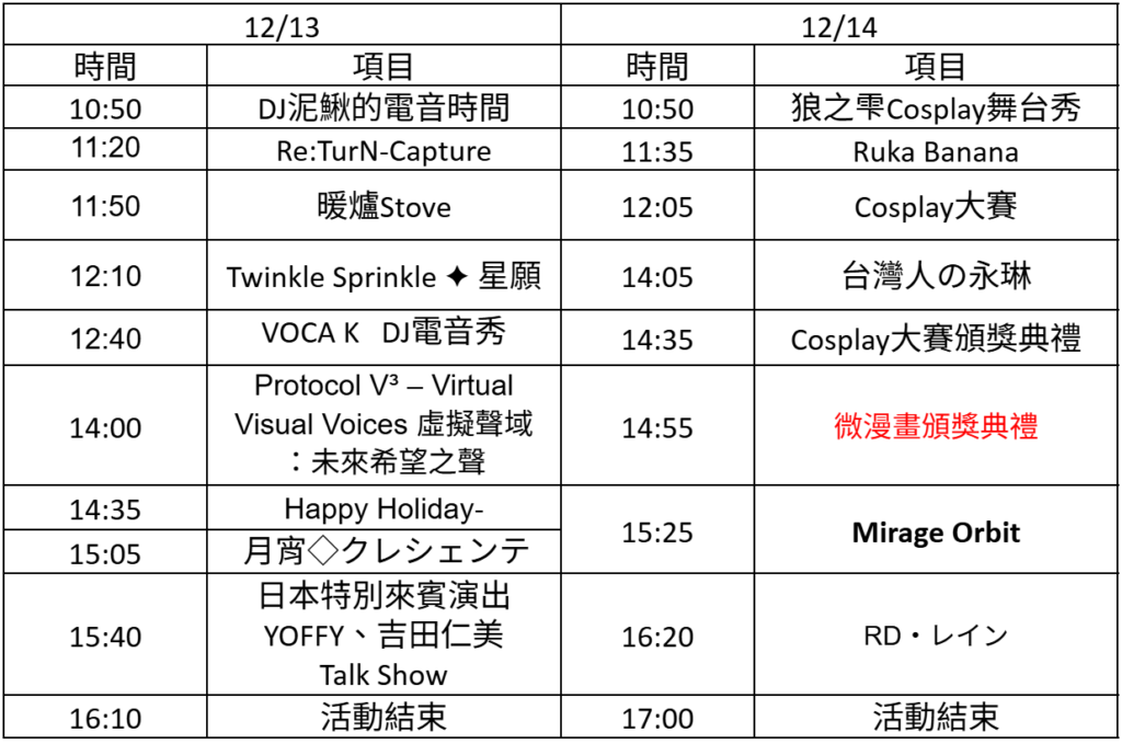 本次規劃「動漫電音派對」「2.5次元動漫秀」豐富多樣化的表演,偶像與各種不同形式的音樂表演再次展現實力,歡迎到舞台前一起搖擺享受音樂!