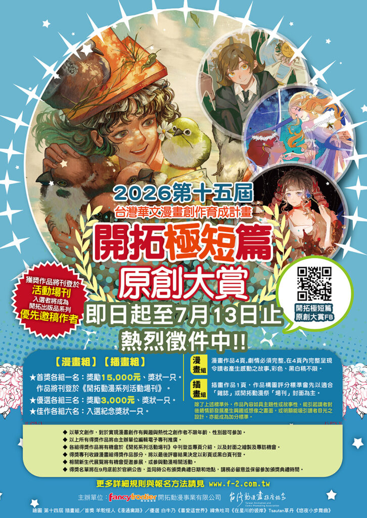 1.請於11507月13日23:59前(以電子郵件時間為憑),將各組所需資料之數位檔案,以E-mail 附件方式寄至「comic@f-2.com.tw」,郵件標題請務必註明「參與徵選者姓名」、「組別」及「參加第十五屆開拓極短篇原創大賞」,未依規定標註者,將視同未完成報名程序。(組別分為:漫畫組、插畫組)