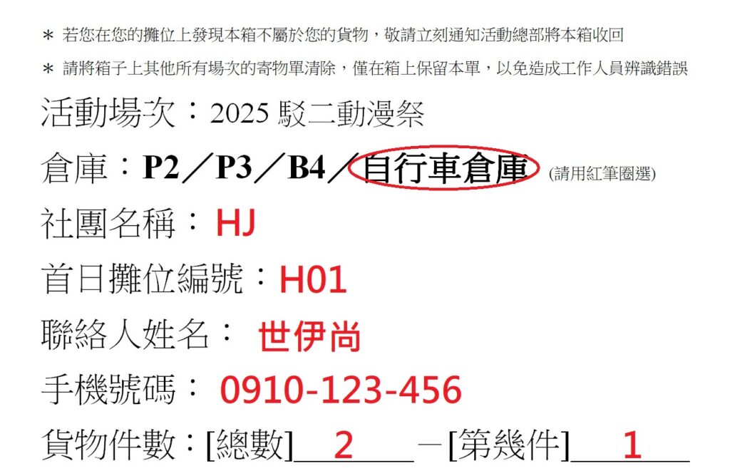 3. 若所寄送的箱子曾在之前其他場次貼過寄物單,請務必將除了本場次之外所有其他的寄物單清除,若因未清除其他場次資料導致工作人員運送失誤,後果由該社團自行負責。