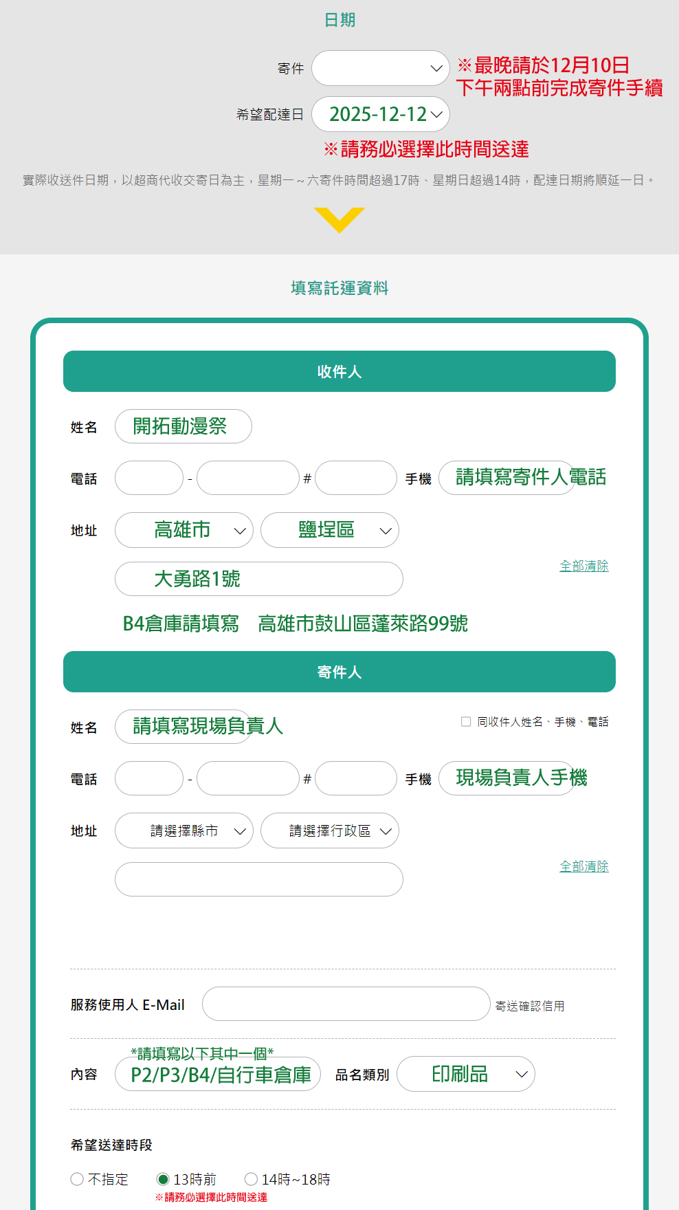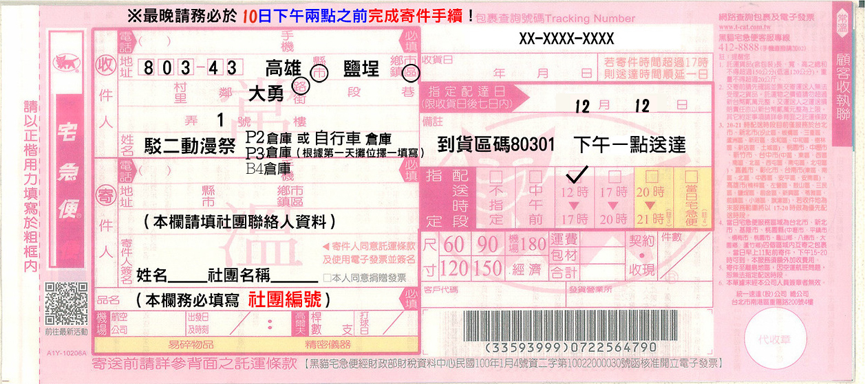5. 照底下填寫樣本之格式填妥您的託運單,並務必清楚寫明送達地址、倉庫(駁二動漫祭 P2倉庫 or P3倉庫 or B4倉庫 or 自行車倉庫、社團名稱、首日/次日攤位編號,送達時間請填寫為活動舉辦前一天之下午13時前(12/12 13時前)。若請印刷廠代為寄送,也務必請對方比照同樣格式寫明送達地點。