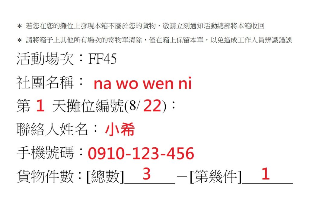3. 若所寄送的箱子曾在之前其他場次貼過寄物單,請務必將除了本場次之外所有其他的寄物單清除,若因未清除其他場次資料導致工作人員運送失誤,後果由該社團自行負責。