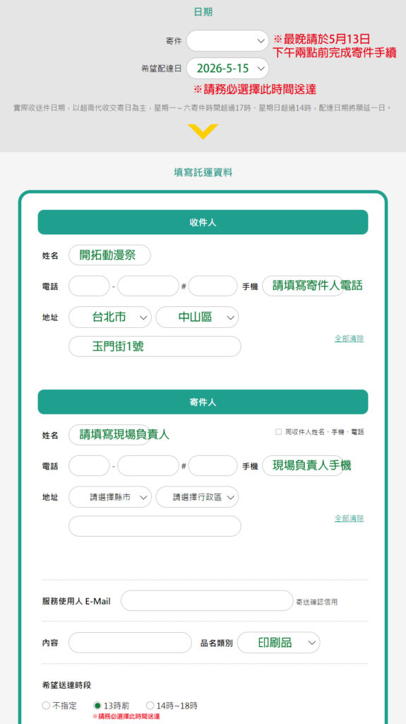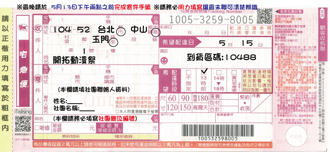 5. 照底下填寫樣本之格式填妥您的託運單,並務必清楚寫明送達地點(臺北市中山區玉門街1號),送達時間請填寫為活動舉辦前一天之下午13時前(5/15 13時前)。若請印刷廠代為寄送,也務必請對方比照同樣格式寫明送達地點。