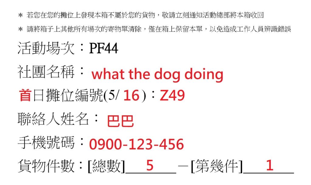 3. 若所寄送的箱子曾在之前其他場次貼過寄物單,請務必將除了本場次之外所有其他的寄物單清除,若因未清除其他場次資料導致工作人員運送失誤,後果由該社團自行負責。